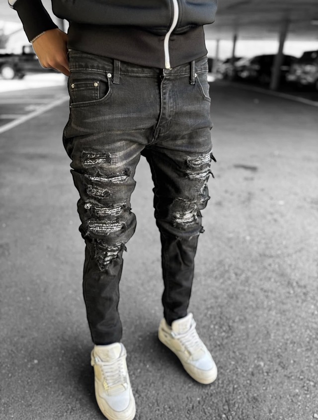 UK US drip スタイル ダメージデニム クラッシュ パンツ ブラック ストリート系 ドリルミュージック y2k B系 ダンサー ヒップホップ ラッパー
