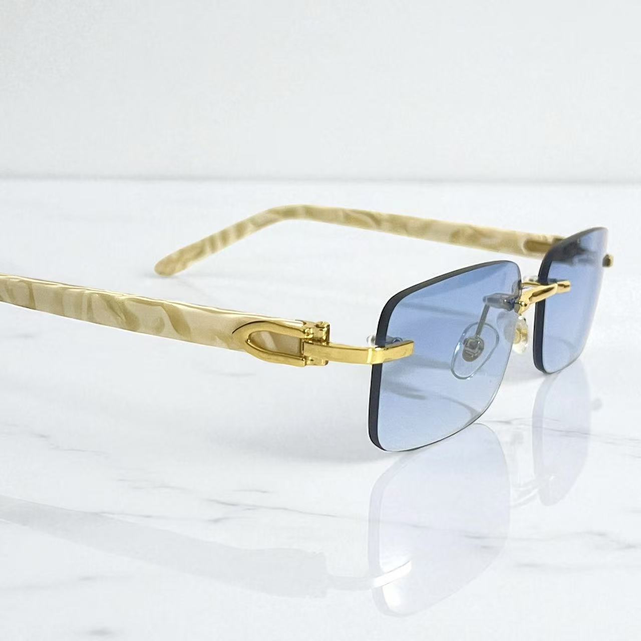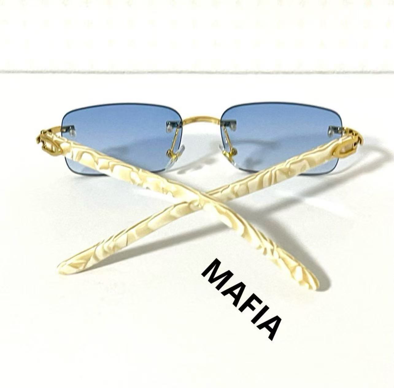 スクエア型のブルーグラデーションレンズが目を引き、コーディネートに爽やかなアクセントをプラス。ゴールドフレームと大理石柄のテンプル(つる)が高級感を演出し、ストリートからモード系まで幅広く活躍します。