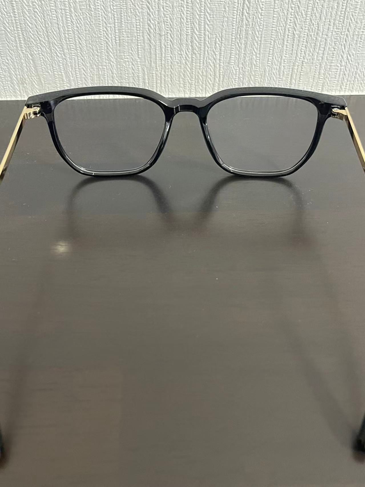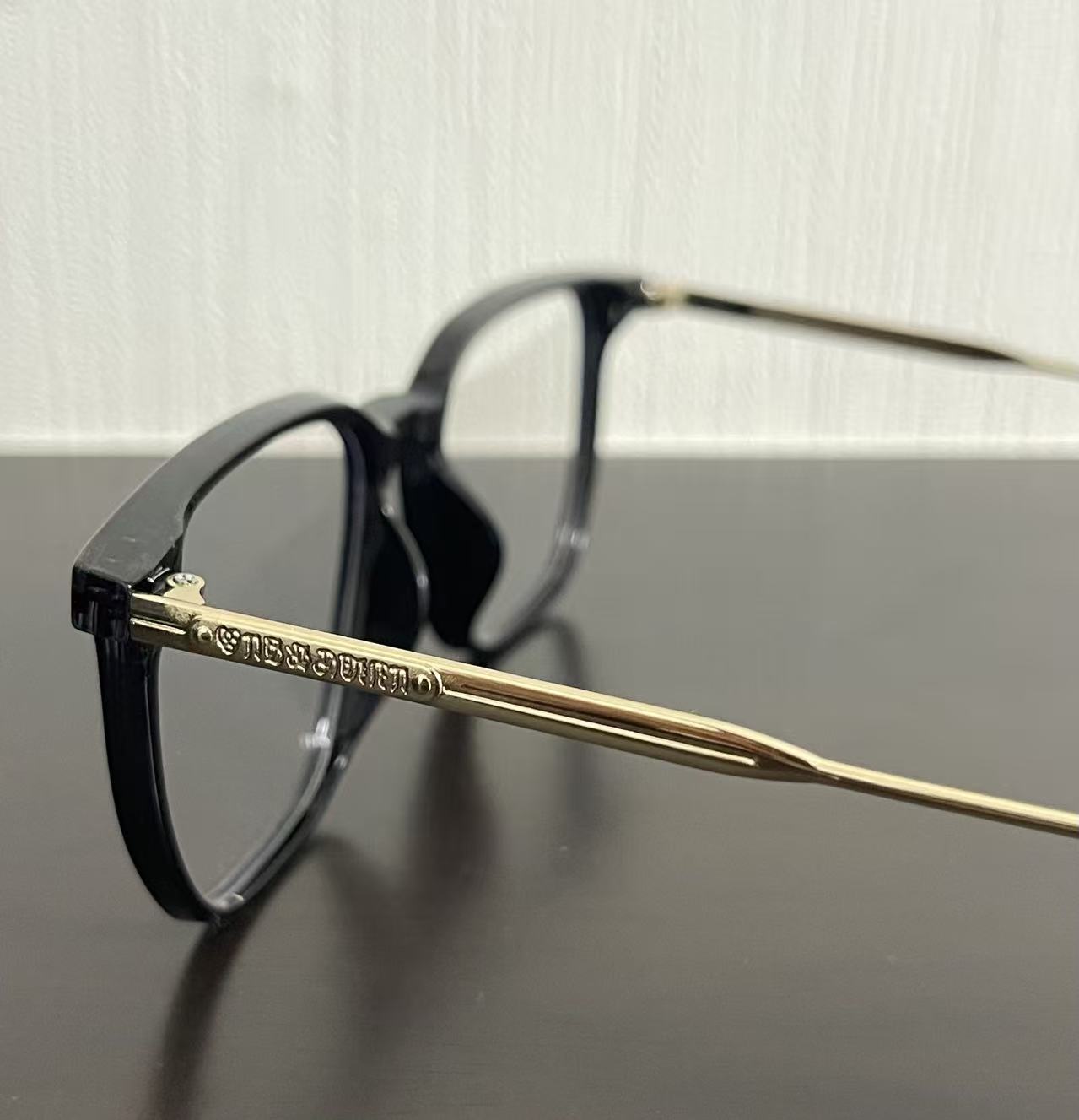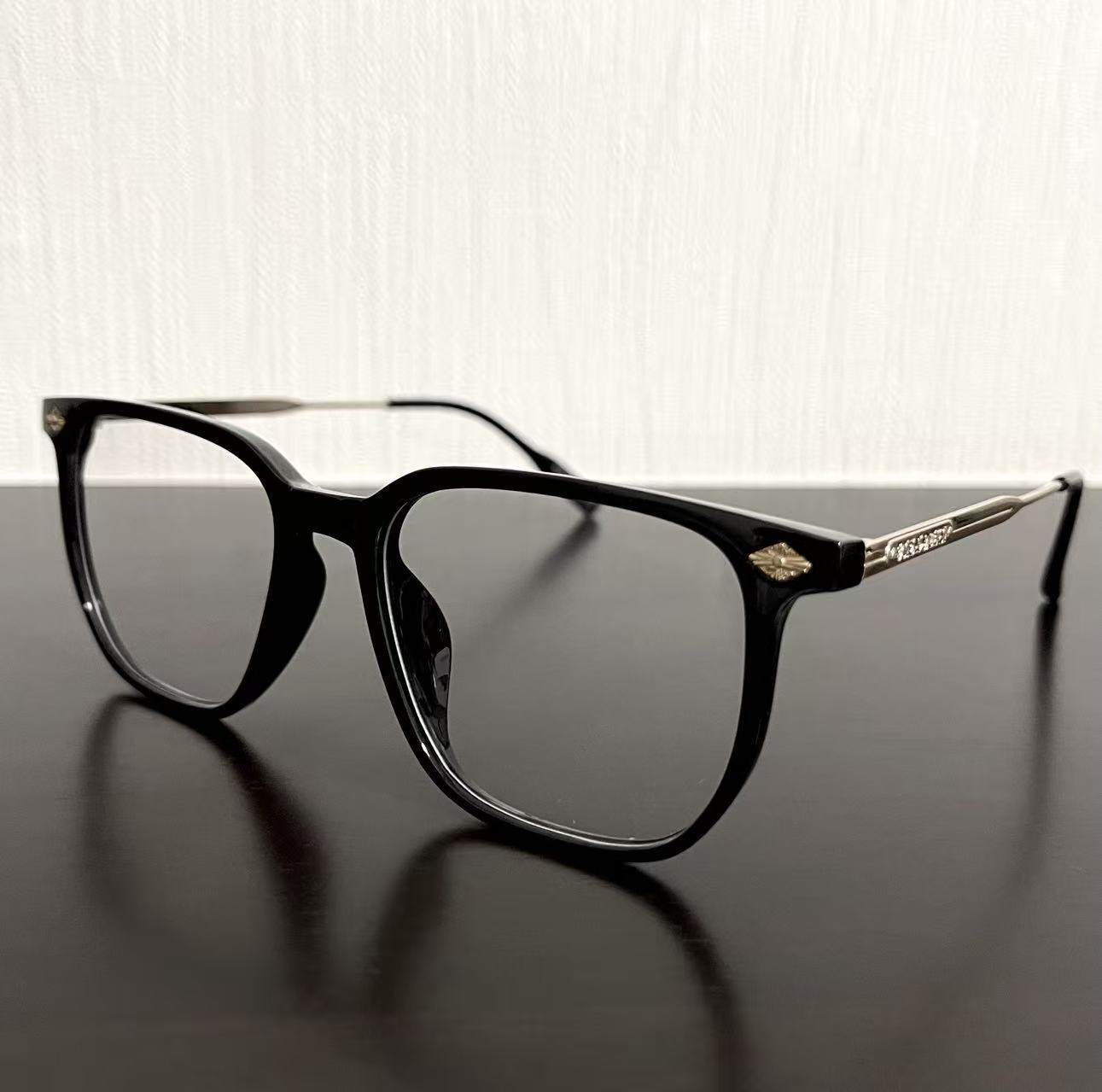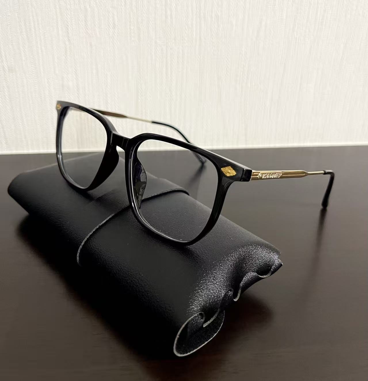 洗練された存在感を放つ黒縁メガネです。艶やかなブラックフレームに、テンプル部分のゴールドのクロス装飾が映え、十字架モチーフがラグジュアリーな印象を演出。クロスチャームのようなディテールは、まるでジュエリーのように輝き、顔まわりに上質なアクセントを与えます。クロムハーツやカザールを愛用する方にもおすすめのデザインで、ストリートラグジュアリーからモードスタイルまで幅広くマッチ。ファッション性と存在感を兼ね備えた、男女兼用のアイウェアです。