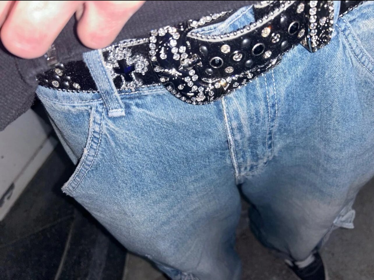 ダメージジーンズ、クラッシュデニム、スキニーパンツなどヒップホップストリートスタイルと合うラインストーンベルト。ゴージャスかつプレミアム感が出るブリンブリンベルトです。