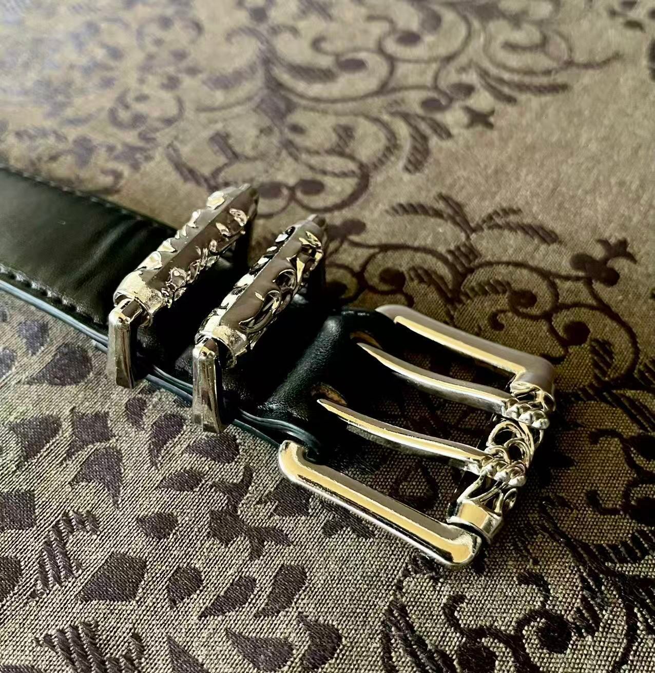 重厚感のあるダブルピンバックルに、繊細な唐草模様の